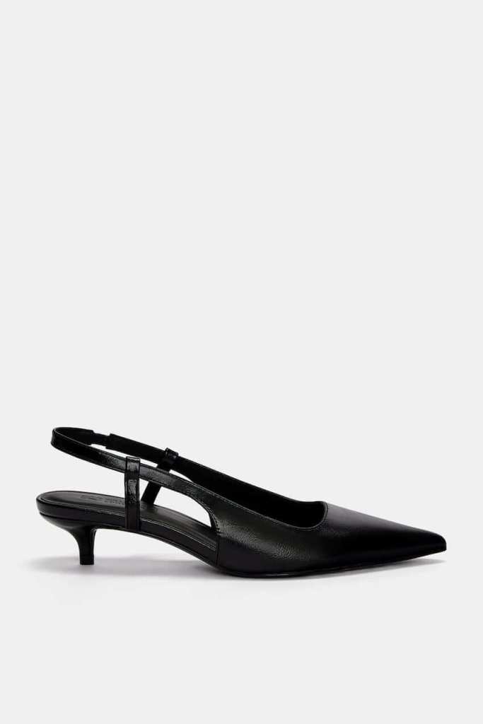 Seguimos con los tacones, pero en esta ocasión unos todavía más bajos para las que quieran ir arregladas pero no incómodas. Se tratan de estos zapatos destalonado con tacón kitten con efecto acharolado, que creemos que son súper versátiles. Los vemos con traje de chaqueta para ir a la oficina, pero también con un vestido de invitada para cualquier boda, bautizo o comunión. Su acabado en punta estiliza muchísimo el pie, y su cierre mediante tira trasera con pieza elástica facilita el calzarlo. Tanto en este color negro como en tan en tendencia color rojo en la primavera, es más que barato (29,99 euros).