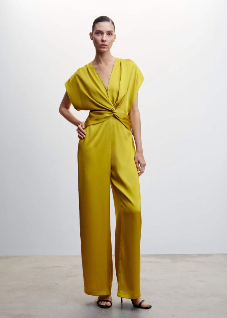 Los monos de vestir más elegantes son aquellos en tejidos satinados, como este de Mango Outlet con un color amarillo que nos encanta. Y es que todo en él es sofisticado: desde su diseño largo a su escote de pico, pasando por su detalle de nudo o por su espalda abierta. De nuevo, estiliza mucho al tener una silueta holgada que se sublima con tacones aún más. Este mono que arrasa entre las mujeres +50 está también tirado de precio, ya que cuesta menos de 35 euros y no nos puede parecer más bonito para ser la invitada ideal (49,99 euros 34,99 euros).