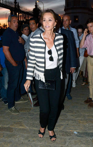 Por último, Isabel Preysler nos deleita con un conjunto que combina elementos clásicos y detalles llamativos para crear un estilo único y memorable. Con un pantalón de corte recto negro, una camiseta blanca básica escotada y una torera bicolor en blanco y negro con flecos en el corte, Preysler demuestra su maestría en la combinación de texturas y colores. Completando el conjunto con unas sandalias negras, este look es perfecto para eventos informales que requieren un toque de distinción y originalidad.