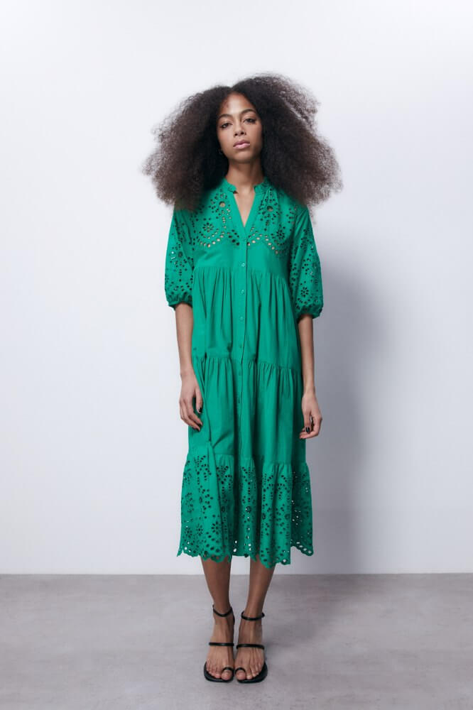 La primavera es la estación ideal para darle color a nuestros looks, así que no es de extrañar que este vestido camisero de Sfera esté causando furor por ese color verde que lo tiñe. Además, cuenta con una silueta romántica y bohemia por esos calados con los que cuenta en las mangas abullonadas y en el bajo. Por supuesto, el confort que aporta al ser tan ancho es un as de esta pieza que además está tirada de precio, pues para ser de nueva colección cuesta también menos de 30 euros (29,99 euros). Está arrasando y la prueba es que en web solo queda una talla de las tres que hay disponibles.
