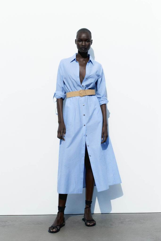 Una opción que estiliza muchísimo en los meses de primavera son estos típicos vestidos camiseros con rayas verticales que se lanzan durante la época, como este modelo de Zara. Con un fondo azul súper en tendencia, pues es el tono rey de la estación, y con rayas blancas, este es ideal para llevarlo a la oficina con unas zapatillas o por la noche con unas bailarinas e incluso con zapatos de tacón. En este caso, este cómodo vestido bastante amplio cuenta con un cinturón a contraste en un tono beis que le combina a la perfección. Y algo que hace que las mujeres +50 terminen de amarlo es su precio, súper barato (39,95 euros).