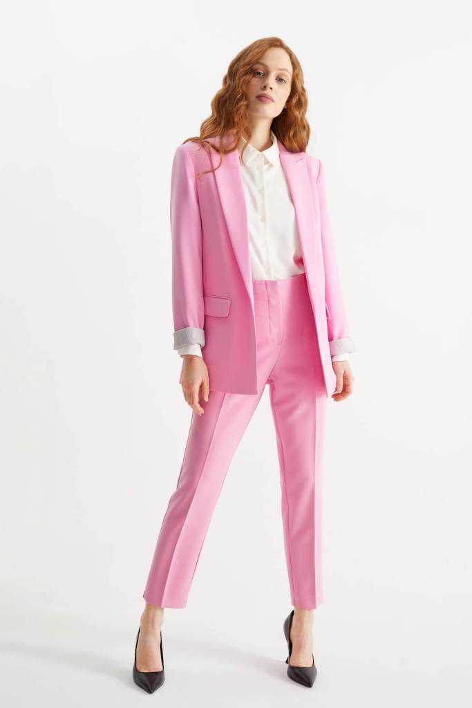 Para las más románticas y femeninas, C&A propone este traje de chaqueta en un rosa chicle ideal para añadir dulzura y un toque rejuvenecedor al look. Ya lo vemos tanto para una madre de comunión como para una invitada a boda, y la prueba es que está arrasando en su web entre las mujeres +50. La blazer es bastante holgada y larga, y cuenta con un diseño bastante clásico (39,99 euros). Mientras que el pantalón cuenta con tela y aberturas cortas en los laterales del bajo, y está tirado de precio (23,99 euros).