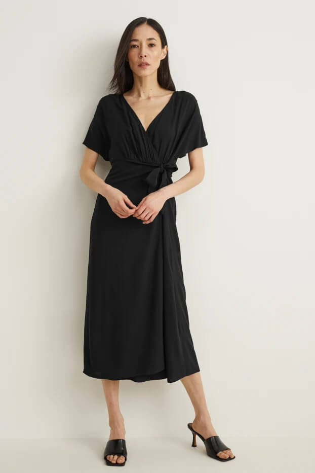 El negro siempre es un clásico atemporal que cada temporada. En este caso, C&A propone un vestido con escote pico de largo midi -15,99 euros- que es sueltecito, pues cuenta con una silueta holgada que puedes justar con su cinturón en la cintura. Como ves en la imagen, queda ideal con unas zapatillas blancas, pero con unas botas negras también pegan.