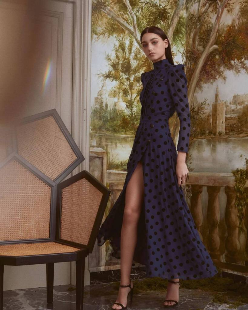 Se trata del modelo Terpsicore, un vestido largo con estampado de lunares negros en terciopelo y fondo en color marino. Tiene varios detalles que enamoran a simple vista, como por ejemplo la abertura al lateral, el cuello perkins siempre tan sofisticado, el plisado frontal, y los botones laterales. Una mezcla de elegancia y comodidad que no pasa desapercibida y se convierte en la opción perfecta para las invitadas de la temporada.