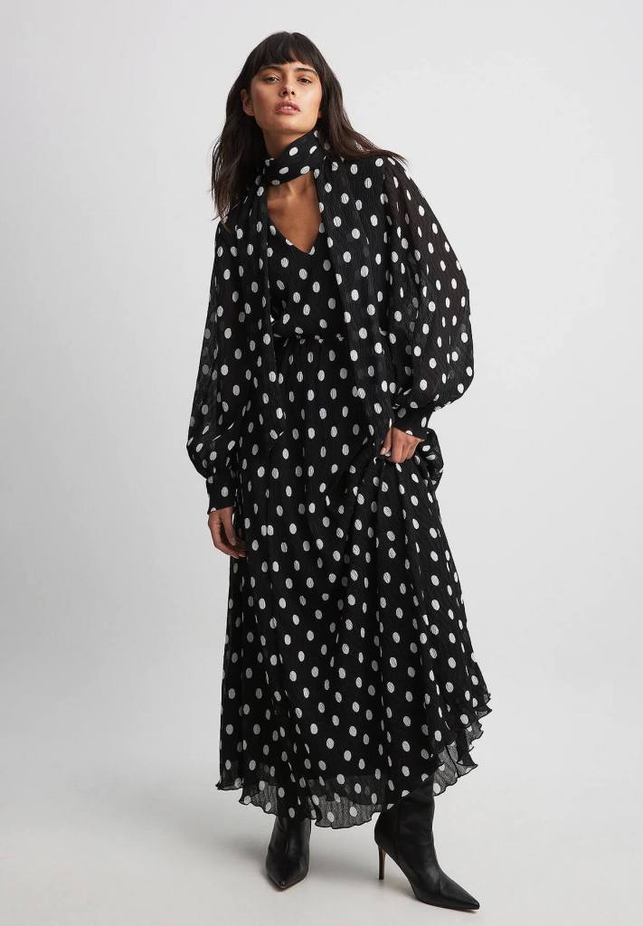 Vestido con estampado de puntos y "bufanda" incorporada con cuello en V y mangas ligeramente abullonadas, de NA-KD. Precio: 69,97 euros.