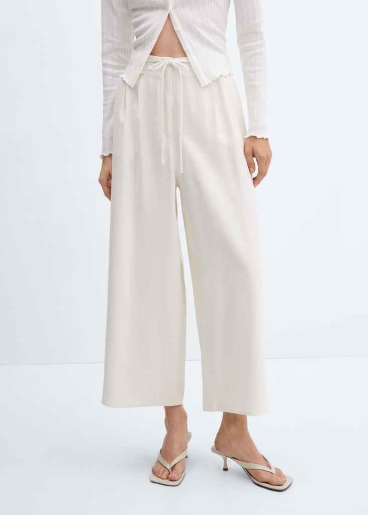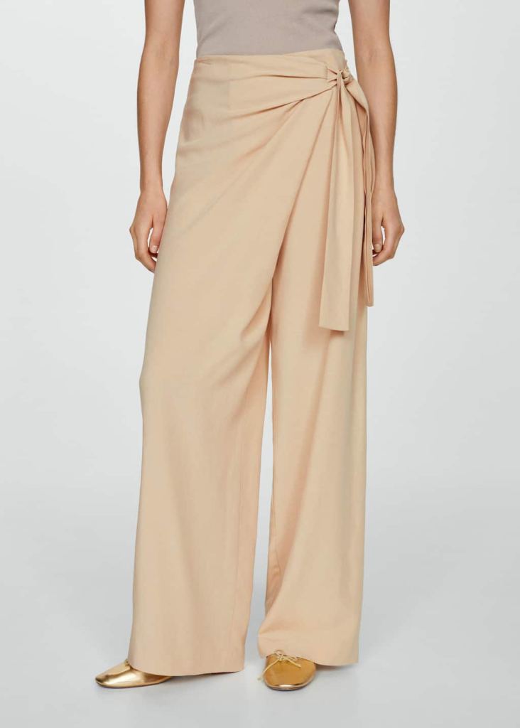 Hay una tendencia súper creciente de este tipo de pantalones anchos y fresquitos con diseño cruzado y detalle de nudo. Al ser beis, combinan con prácticamente todo: tanto con una camiseta blanca y unas zapatillas como con una blusa y unas bailarinas. Es ideal para disimular tripa y también tiene un efecto favorecedor en las piernas. Este modelo de Mango cuesta 39,99 euros.