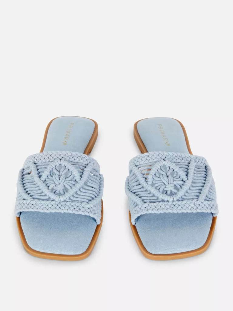 Otra de las marcas donde podemos encontrar sandalias planas a un precio muy bajo es en Primark. Por ejemplo, este modelo de pala cuenta con una tira de punto de intrincado diseño, que le aportan un toque estival. Y al ser de color azul cielo son perfectas para estos looks de playa. De nuevo, son súper baratas (12 euros).