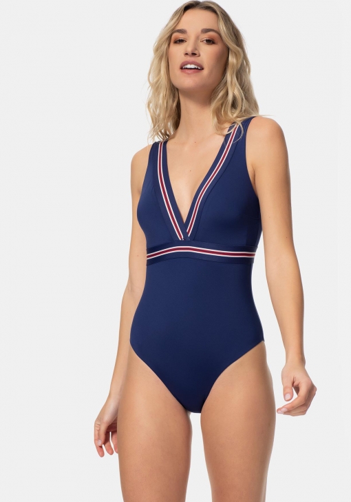 Este bañador en azul marino estiliza muchísimo por su color oscuro, pero también por el diseño de cuello en pico con detalles en rojo que lo hacen una opción de estilo marinero. Ya lo vemos combinado con un caftán blanco y con un capazo de rafia para ir a la playa. Este modelo en concreto está rebajado en Carrefour y también se queda muy barato para estrenarlo en las vacaciones de verano (24,99 euros 12,99 euros).