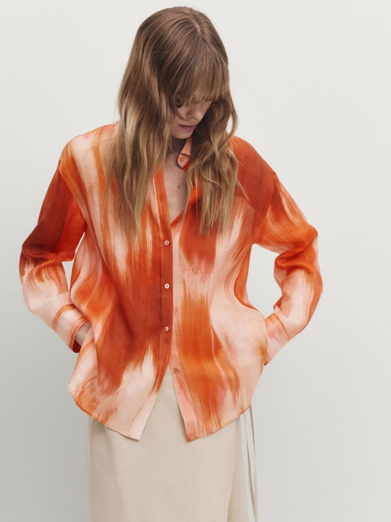 Un color que nos encanta mezclar con el fucsia es el naranja, así que en Massimo Dutti también encontramos camisas de lino rebajadas con este tono tierra. En este caso, es un modelo estampado con acabado tie dye que puede quedar genial con una falda midi beis y sandalias del mismo color. De nuevo, es una opción holgada y ligera que cuesta menos de 30 euros (59,95 euros 29,95 euros).
