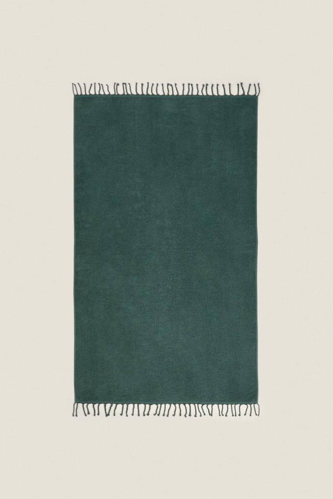 Otra opción perfecta para los amantes del minimalismo. Una toalla de rizo de algodón de playa en color liso, acabada con flecos retorcidos a lo ancho, de Zara por el precio de 35,50 euros.