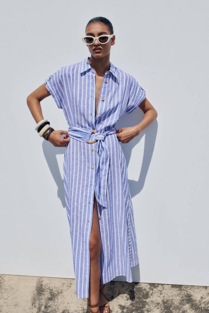Empezamos con un clásico: un vestido de rayas azules y blancas con silueta camisera. Este es un fondo de armario estival para muchas mujeres por dos razones. La primera, porque como ya hemos comentado estiliza mucho al tener las rayas verticales y crear ese efecto óptico de alargar el cuerpo. Y en segundo lugar porque es un diseño cómodo que vale tanto para ir a la playa como para cenar en una terraza. En este caso, este modelo de lino se queda muy barato (59,99 euros 39,95 euros).