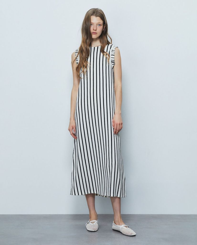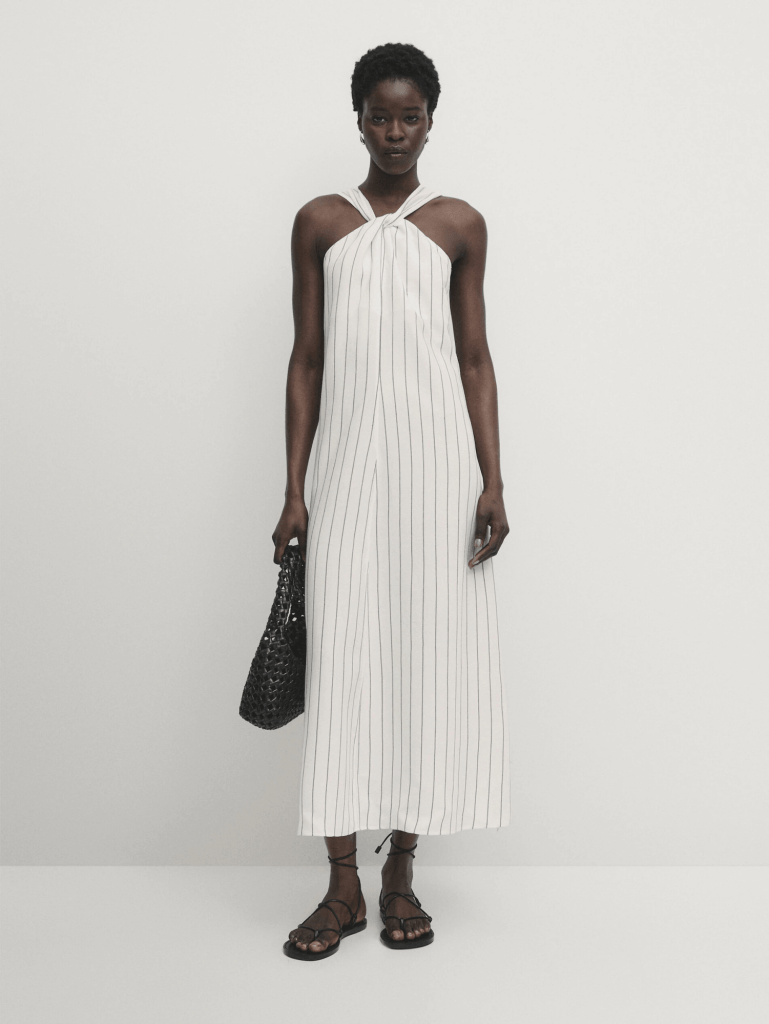 Aunque, a priori, asociemos estos vestidos de rayas con situaciones más informales, también hay modelos en los que merece la pena invertir estas rebajas porque son ideales para ocasiones más especiales. Es el caso de esta opción de Massimo Dutti: una elegante prenda blanca con unas rayas muy finas negras que podemos llevar tanto con sandalias de tacón como con zapato plano. Su cuello halter con tirantes anchos es uno de los detalles más especiales de este vestido rebajado un 20% (89,95 euros 69,95 euros).