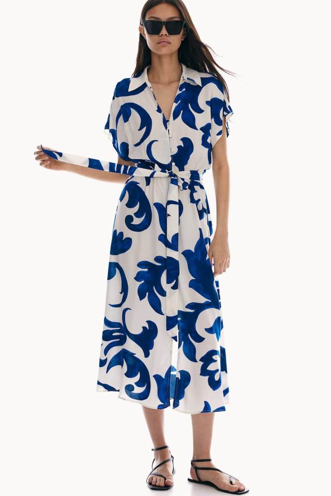 Aunque si no tienes que vestir muy formal en el trabajo, en los primeros días de oficina también puedes llevar esos vestidos camiseros que más vemos en verano: los estampados. Esta opción de H&M por el estilo mediterráneo que le aportan el blanco y el azul klein, y por esas flores tan femeninas. De nuevo, es ancho y ligero, y se queda muy asequible en las rebajas de esta firma (39,99 euros 25,99 euros).