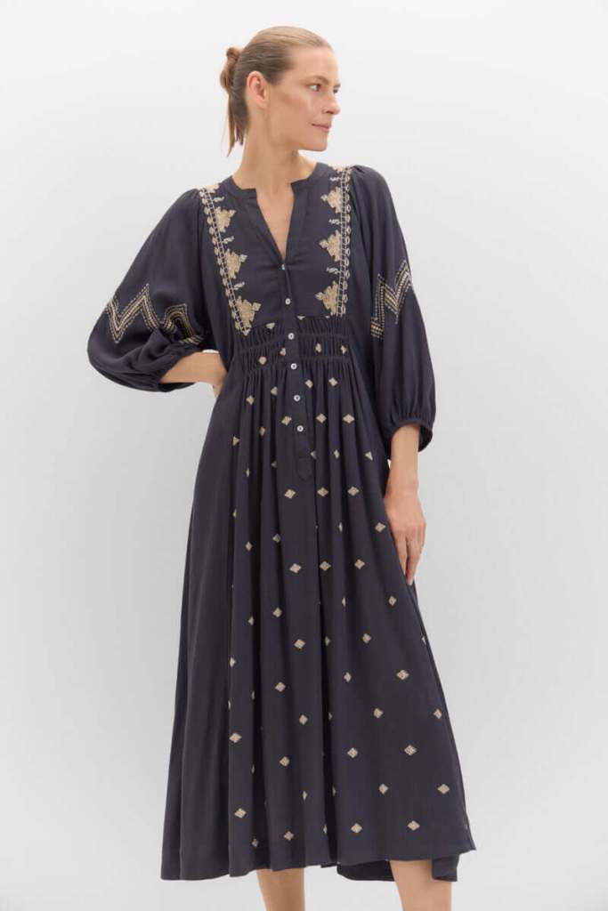 Este vestido es perfecto para lucir en las últimas noches de verano por el estilo bohemio que le confieren sus bordados, pero es que también es ideal para llevar en otoño por su color oscuro y porque queda ideal, por ejemplo, con unas botas camperas. Esta pieza de Cortefiel cuenta con su cuello mao con detalle de canesú bordado, detalle de elásticos fruncidos en cintura que lo hacen cómodo y una manga larga abullonada que aumenta este confort (89,99 euros).