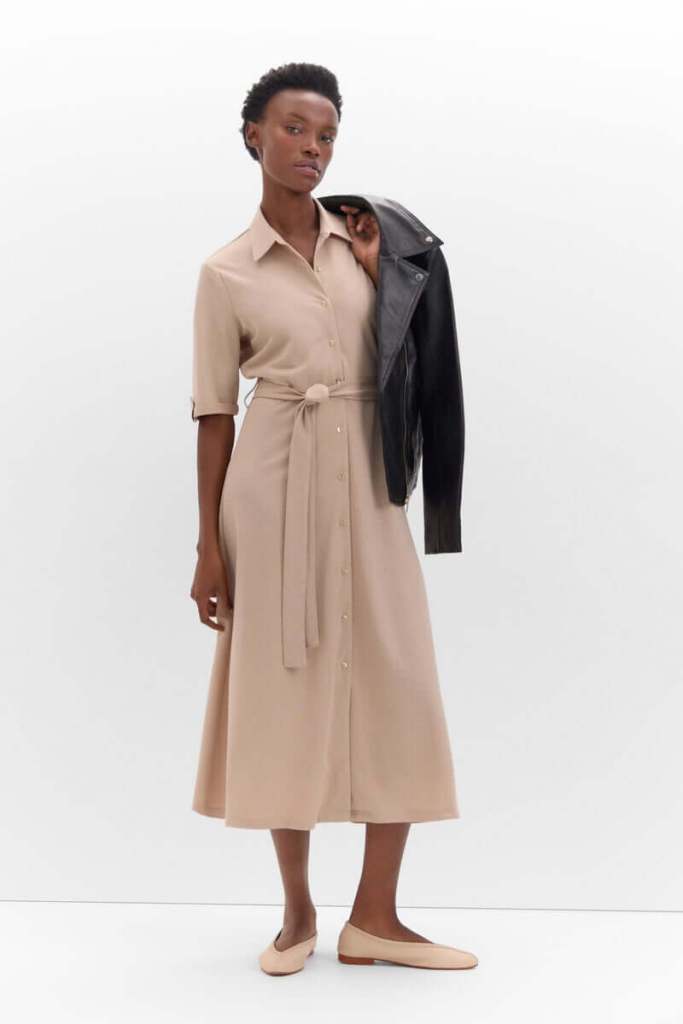 Las prendas neutras en tonos tierra son un esencia en los meses otoñales, así que nada mejor que un vestido con silueta camisera que estilice a la vez que proporcione elegancia. Es el caso de este de Cortefiel, con tejido fluido que es perfecto para que las mujeres +50 lo lleven ahora en verano con unas sandalias o más adelante con bailarinas y una blazer (69,99 euros).