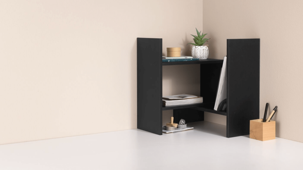 Para apoyar documentos o carpetas más grandes y tenerlas guardadas todas en una zona concreta, puede ser muy práctica esta estantería combinable. Es decir, esta es configurable en cuatro variantes básicas: compacta, semiextendida, completamente extendida o en la esquina, como en imagen superior. Además de ser útil para ordenar, también es bonito para decorar el despacho o tu mesa de la oficina (12,99 euros).
