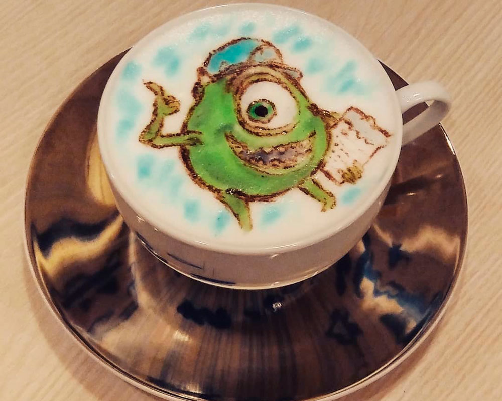 Todo vale para decorar la superficie de un café. Cuando ya seas un experto en los diseños más fáciles, puedes buscar inspiración en los personajes de películas infantiles, como los protas de Monstruos S.A.