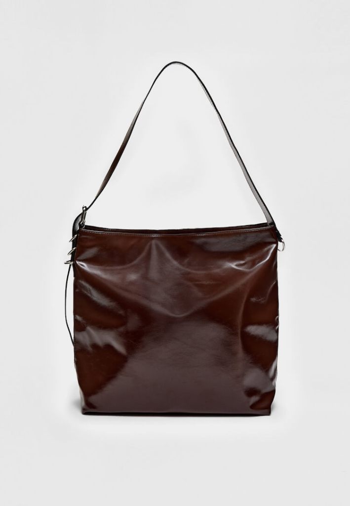 Su buscas un modelo en tendencia, desde luego tienes que hacerte con un bolso bucket de Stradivarius. Este modelo cuadrado de efecto charol marrón chocolate se lleva muchísimo, porque cabe de todo en él pero a la vez es moderno para rejuvenecer un look. Y, además, está tirado de precio (22,99 euros).