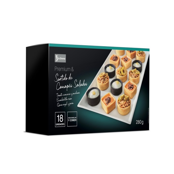 La Sirena ofrece también una bandeja de canapés salados con tres variedades. Estas son la tartaleta rellena de preparado de ensaladilla; tartaleta rellena de crema de queso azul y pera confitada; tartaleta rellena de crema de queso con tomate semiseco y anchoa. Vienen 18 unidades y, al estar congelados, están listos para servir. El fabricante recomienda sacarlo de 5 a 6 horas antes. Tiene un precio de 16,99 euros.