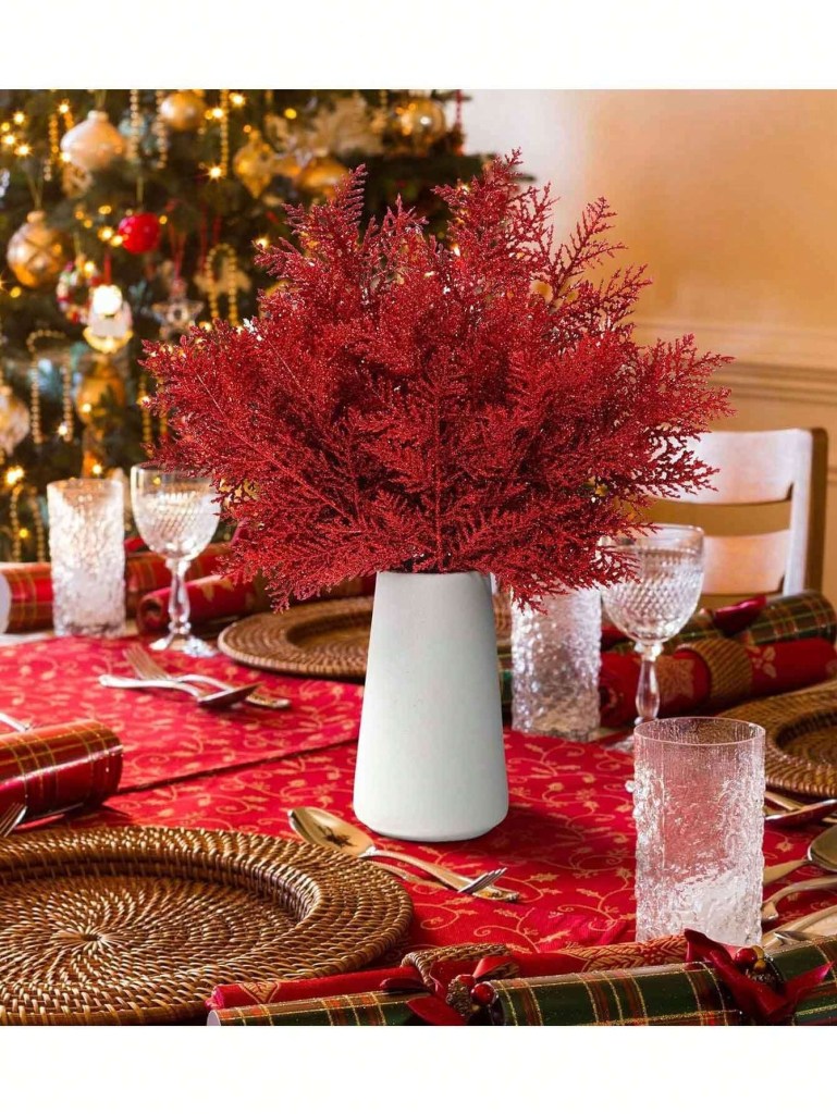 Flores naturales como la de Pascua, puede ser muy complicado su cuidado y que dura hasta pasado reyes. Te puedes animar a hacer centros de mesa de flores artificiales o secas que te servirán para otra decoración. En Shein está este pack de 10 piezas de agujas de pino con brillo en color rojo para decorar coronas de flores navideñas o decorar invitaciones felicitando el año. El precio del pack es de 2,25 euros.