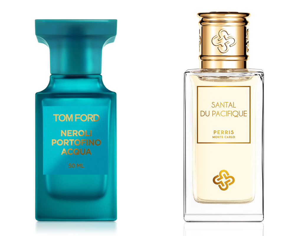 Neroli Portofino Acqua (129 €/50 ml.), TOM FORD. Santal du Pacifique (125 €/100 ml.), PERRIS MONTECARLO.