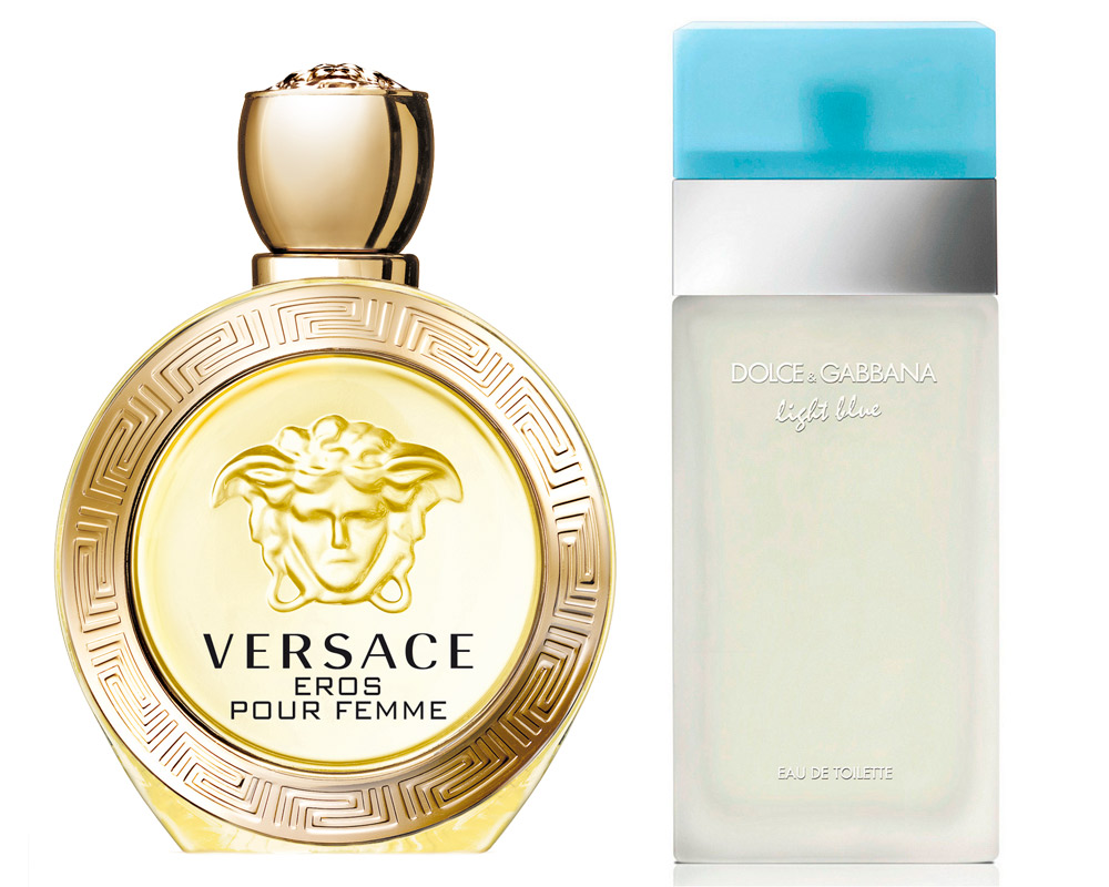 Eros pour Femme Eau de toilette (66 €/30 ml.), VERSACE. Eau de toilette Light Blue (41 €/25 ml.), DOLCE&GABBANA.
