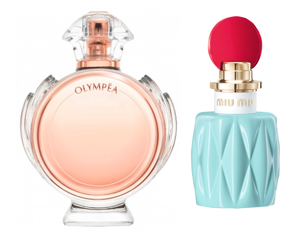 Eau de parfum Olympea (53 €/50 ml.), PACO RABANNE. Eau de parfum Miu Miu (80 €/50 ml.), MIU MIU.
