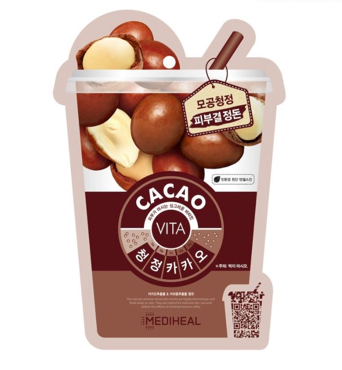 Esta mascarilla facial de tencel a base de cacao elimina la suciedad de los poros dejando una piel limpia y purificada, además de controlar el sebo. CACAO VITA MASK, de MEDIHEAL (1,90 euros en Planet Skin)