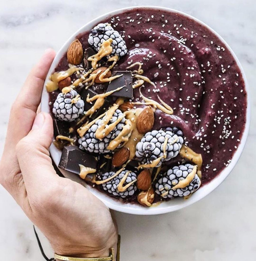 Las mantequillas elaboradas con frutos secos (anacardos, almendras, cacahuetes), enamoran a los amantes dela vida y la alimentación sana. En este caso, el acai bowl está endulzado con mantequilla de almendra.