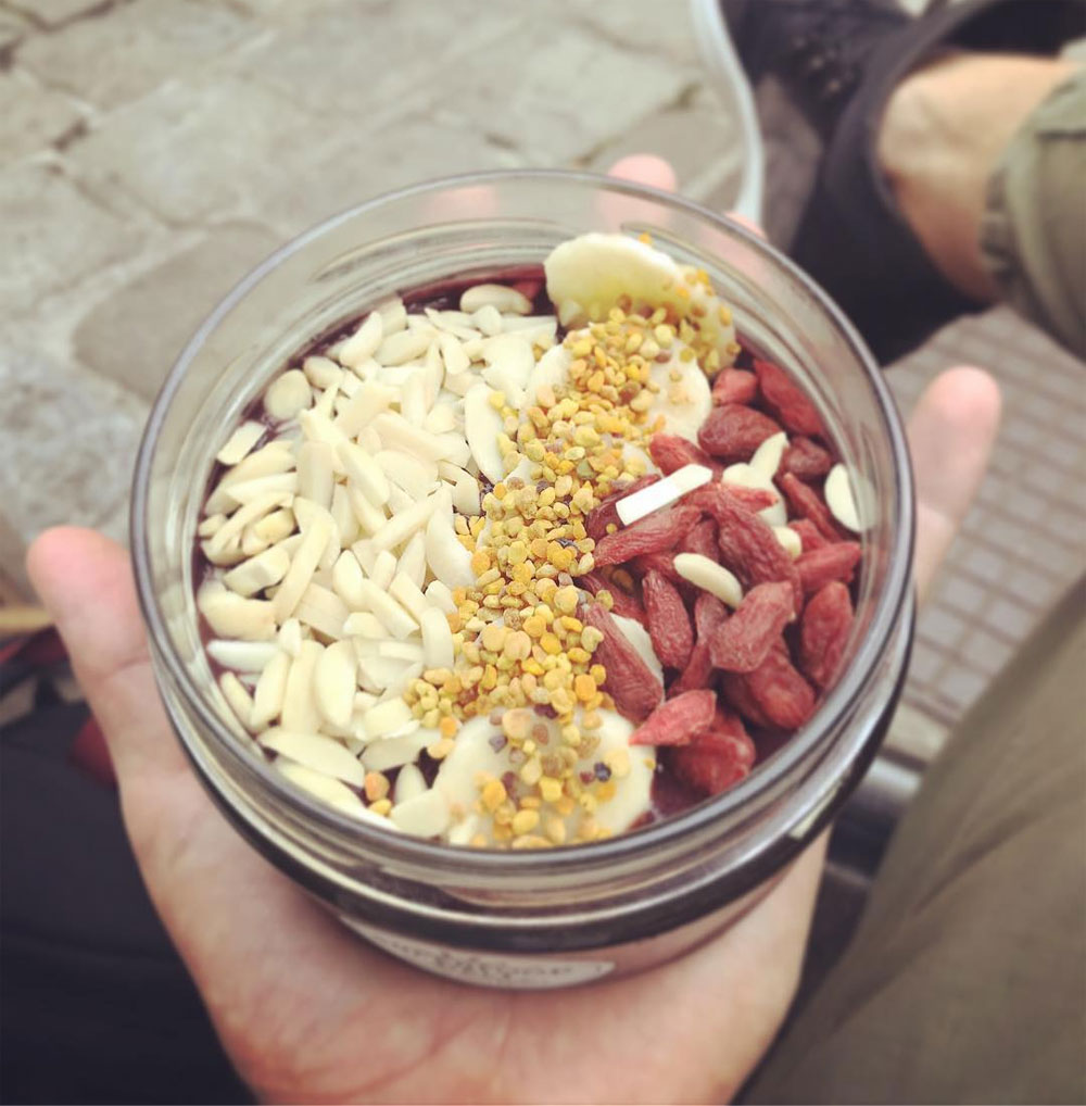 Después de una sesión de ejercicio, no hay mejor plan que un acai bowl. En vez de presentardo en un bol, en este caso se presenta en una tarro para llevar y ¡problema resuelto!