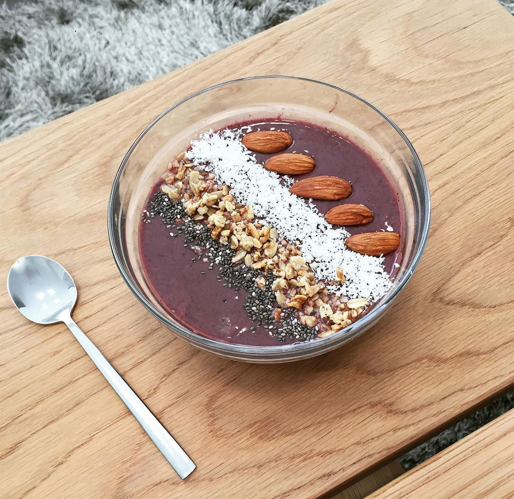 Acai bowl con arándanos, coco y mantequilla de almendra
