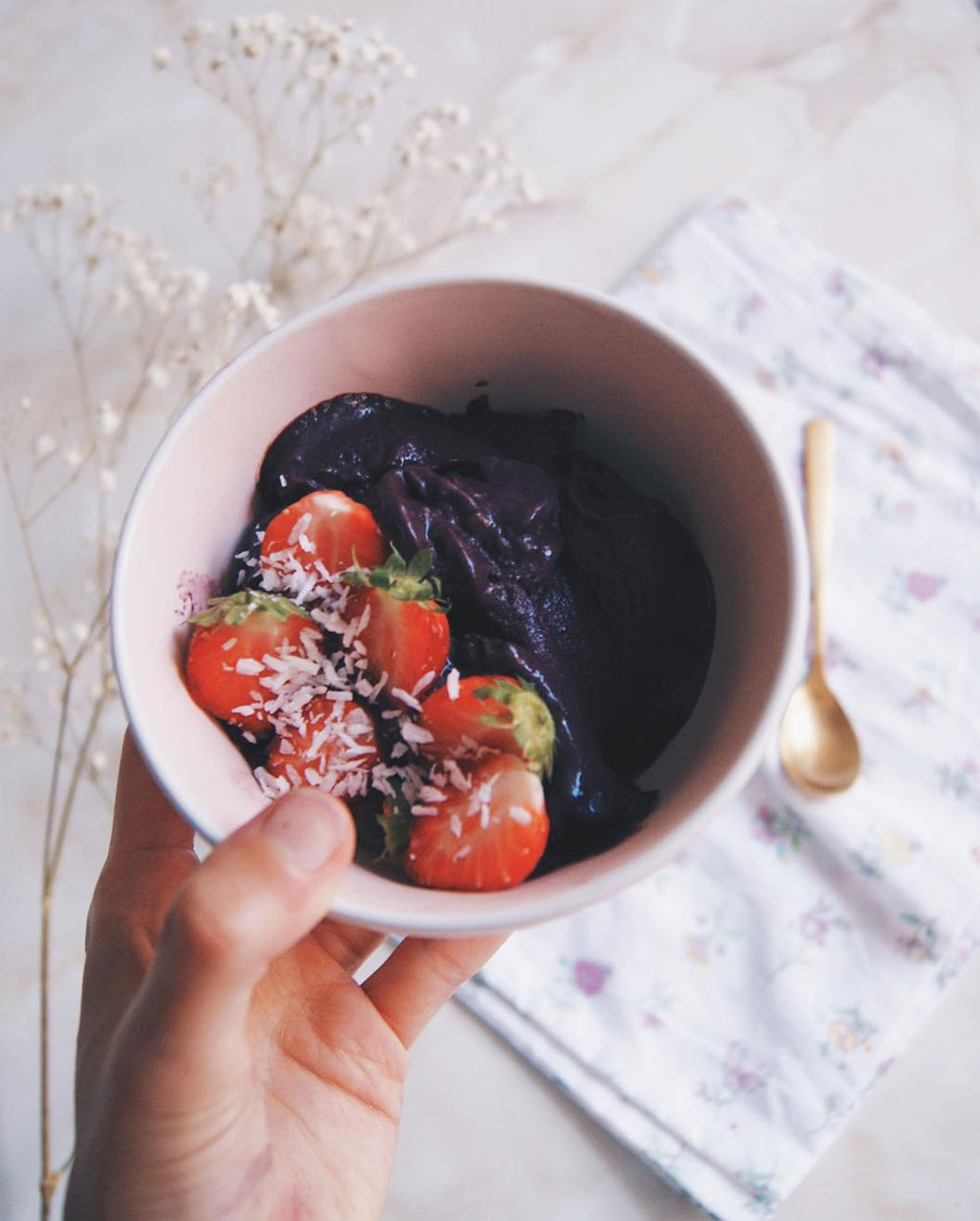 La instagramer española @_thinking_healthy comparte en esta red social su primer acai bowl. Tras conseguir la pulpa congelada de esta fruta (difícil de encontrar), la ha combinado con plátano congelado y leche de almendras. Unas fresas y un poco de coco rallado como toppings rematan la faena.