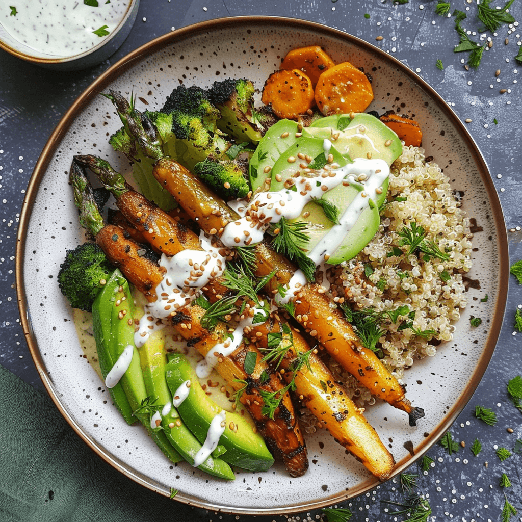 Lentejas con quinoa, zanahorias asadas y mayonesa de yogur y aguacate