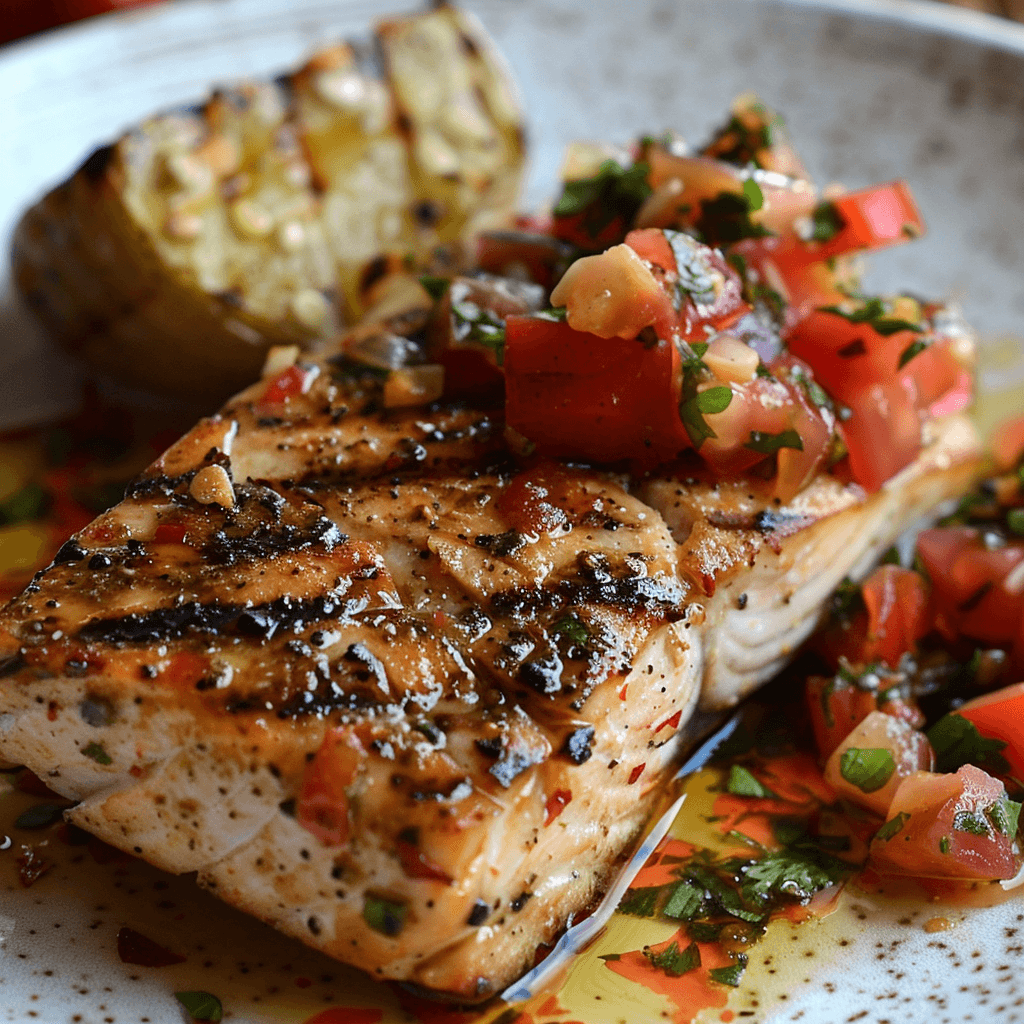 Bonito del norte a la plancha con crujiente de sésamo y puré de boniato y vinagreta de pico de gallo