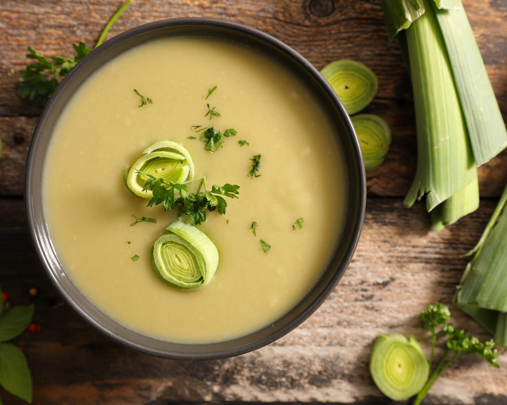 Se lavan y se cortan en dados 500 g de puerros, 500 g de zanahorias, 250 g de patatas y 2 ajos. Doramos los ajos en una cacerola con aceite de oliva, después añadimos las verduras, las rehogamos unos minutos y cubrimos con agua. Dejamos cocer 35 min a fuego lento, salpimentamos, retiramos del fuego y pasamos por la batidora.
