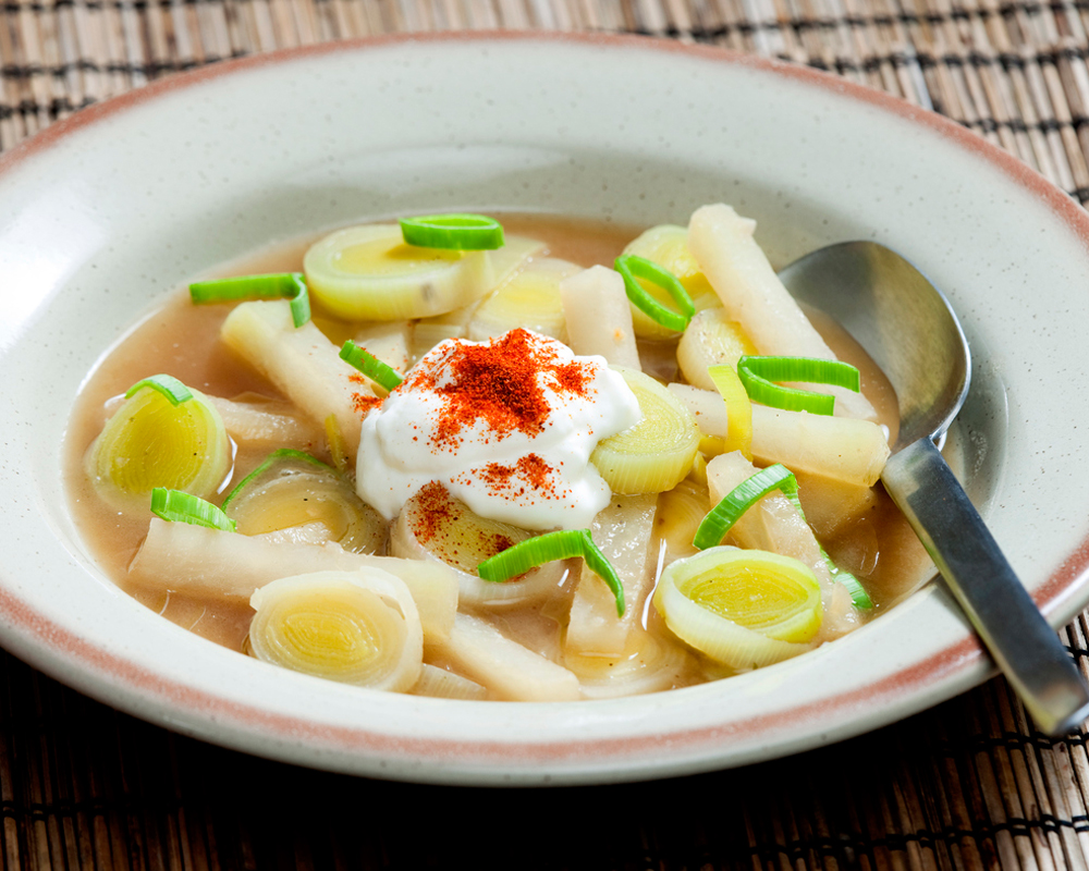 Los puerros se pueden tomar crudos o cocidos. Disfruta de su exquisito sabor en una de las recetas más clásicas: puerros a la vinagreta. Prueba a aderezarlos con una salsa de anchoas y bonito. Prepara con ellos una delicada crema o bien hazlos estofados con mantequilla para acompañar un chuletón a la brasa o una pechuga de pollo. También son una guarnición excelente para los pescados como el salmón a la plancha. En esta galería descubrirás los beneficios del puerro para la salud y algunas recetas para cocinar con ellos.