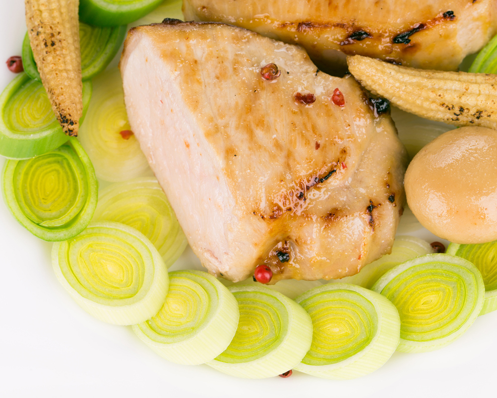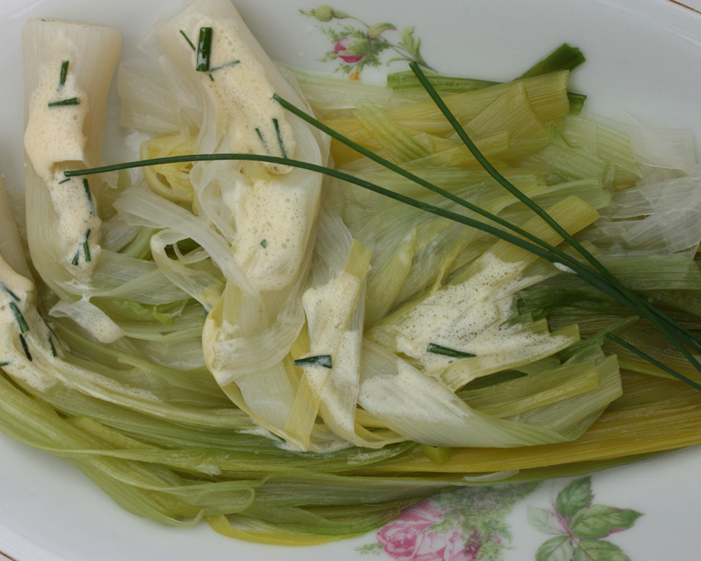 Rehoga 4 puerros limpios y cortados por la mitad, en aceite y mantequilla caliente. Cuando estén dorados añade una taza de caldo de pollo y una cucharadita de tomillo fresco picado. Con la cazuela destapada, cocina hasta que se reduzca el caldo, más o menos 10 minutos, y añade la cáscara de limón. Sazónalo con zumo de limón, sal y pimienta.