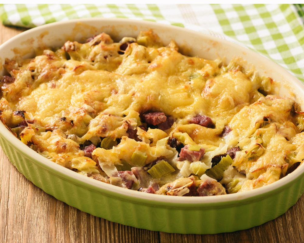 Fríe muy bien dos tiras de bacon y déjalo sobre una servilleta para que se escurra la grasa. Después córtalo y resérvalo. Rehoga 5 puerros limpios en aceite de oliva hasta que queden tiernos, aproximadamente 10 minutos. Agrega un vaso de nata y cuece a fuego lento. Coloca la mezcla en una fuente de horno y ponle una capa fina de migas de pan integral y otra de queso gruyere rallado con un poquito de ajo. Gratina durante 20 minutos y añádele el bacon por encima.