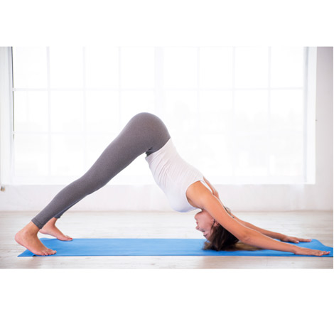 Perro cabeza abajo o Adho Mukha Svanasana: consiste en formar una 'V' invertida con el propio cuerpo. Empieza a cuatro patas sobre el suelo con la espalda recta, las manos debajo de los hombros y las rodillas justo debajo de las caderas. Levanta la cadera y estira las piernas. Los dedos de la mano han de estar bien abiertos para dar una base sólida. De esta forma se estiran hombros, muslos y pantorrillas, además de fortalecer piernas y brazos.