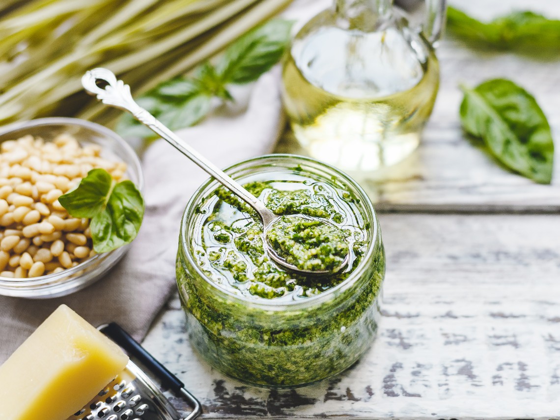 Típica de Italia, la salsa pesto confiere un gusto muy particular a las pastas, pizzas y carnes. Ahora bien, aunque es deliciosa, también es muy calórica. Sus ingredientes son aceite de oliva, queso de oveja y parmesano, albahaca, ajo y piñones, una mezcla que eleva su contenido calórico hasta las 534 calorías por cada 100 gramos.