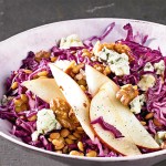 Coloca las lentejas en el fondo de un plato, la col escurrida sobre ellas y decora con la manzana, las nueces y el queso