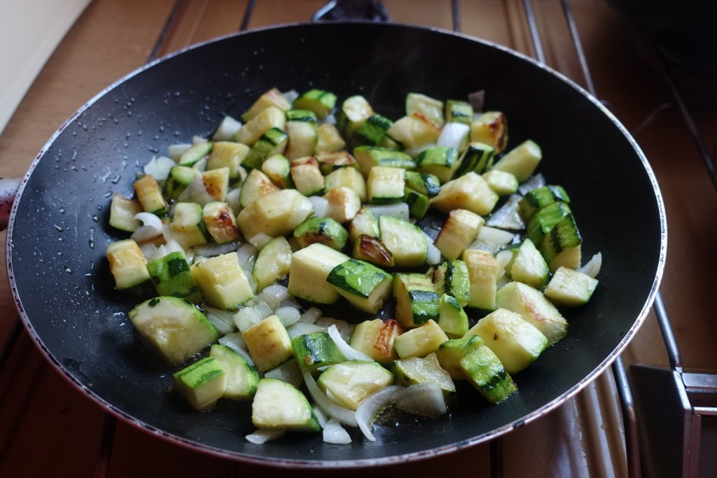 Lo que más nos ha gustado es la elaboración, que es sencilla y cómoda. Solo necesitas calentar en una cazuela con aceite, para añadir los calabacines cortados en dados y sazonados. Cuando esté pochado, añades el puerro cortado y limpio.