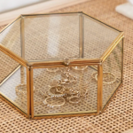 - Joyero de Cristal Moira de Sklum: Con un diseño que derrocha sofisticación, nos recuerda a una pieza rescatada de un anticuario, un toque vintage. De forma hexagonal combina una estructura en resistente latón con vidrio de alta calidad.