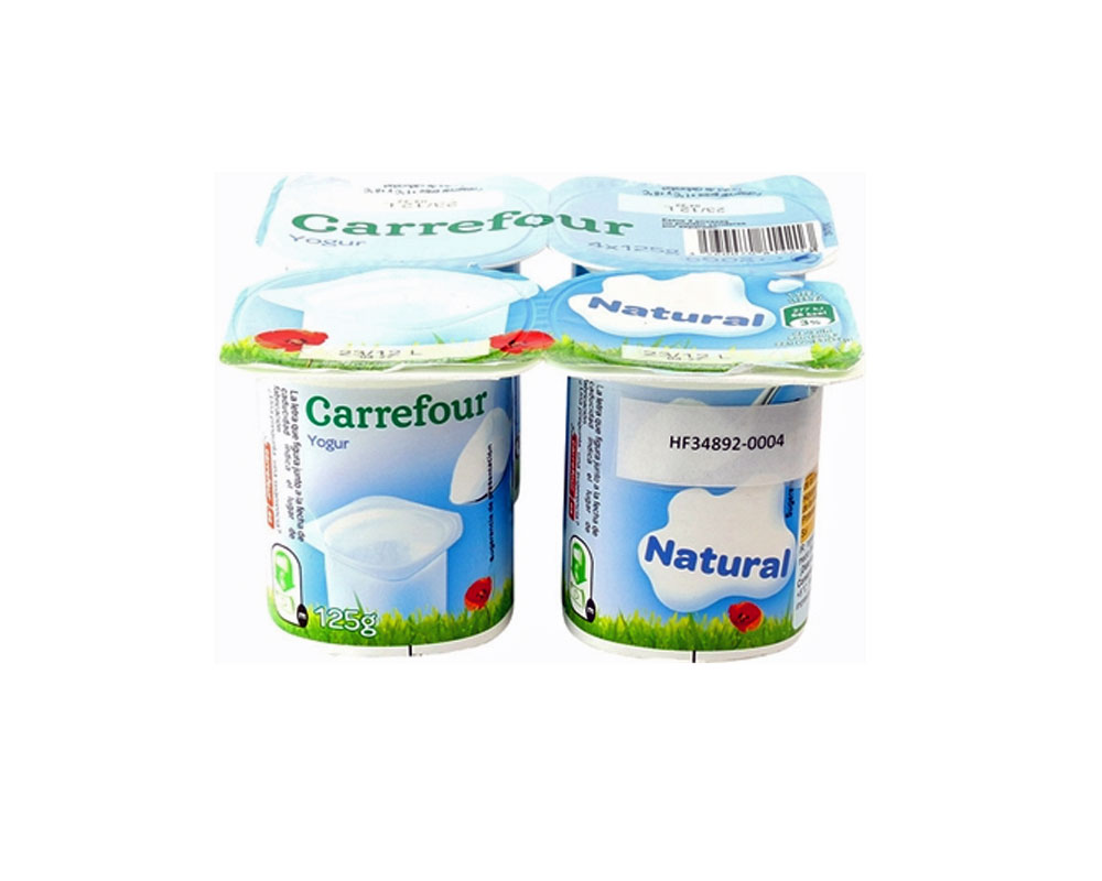 El yogur natural Carrefour cuenta con una valoración de 71 sobre 100, es decir, una buena relación calidad precio. Entre sus ingredientes destacan: leche parcialmente desnatada, proteínas de leche, lactosa y fermentos lácticos. Su precio es de 0,53€ por cada envase de cuatro.
