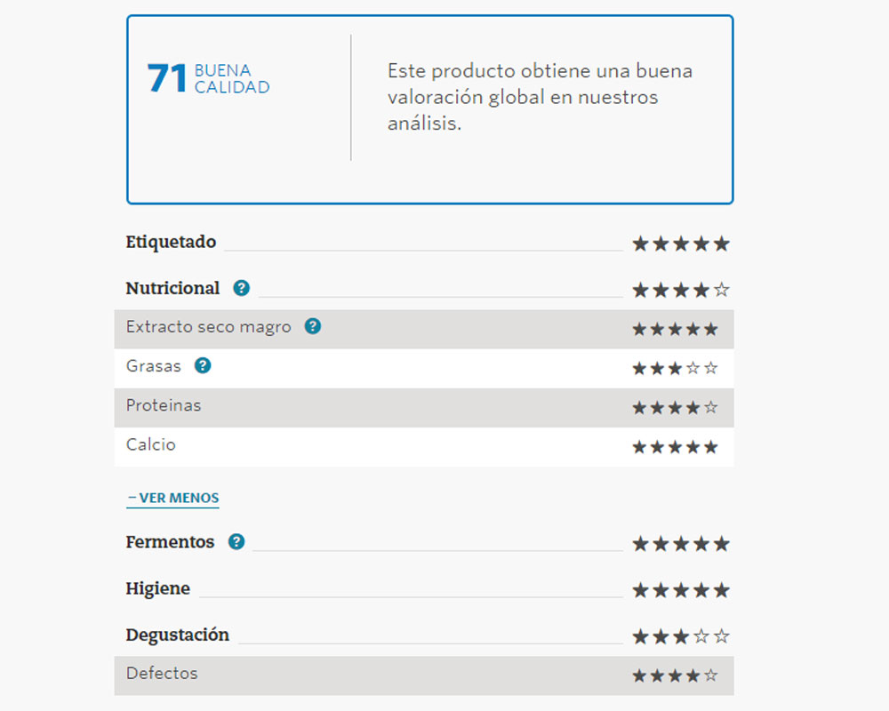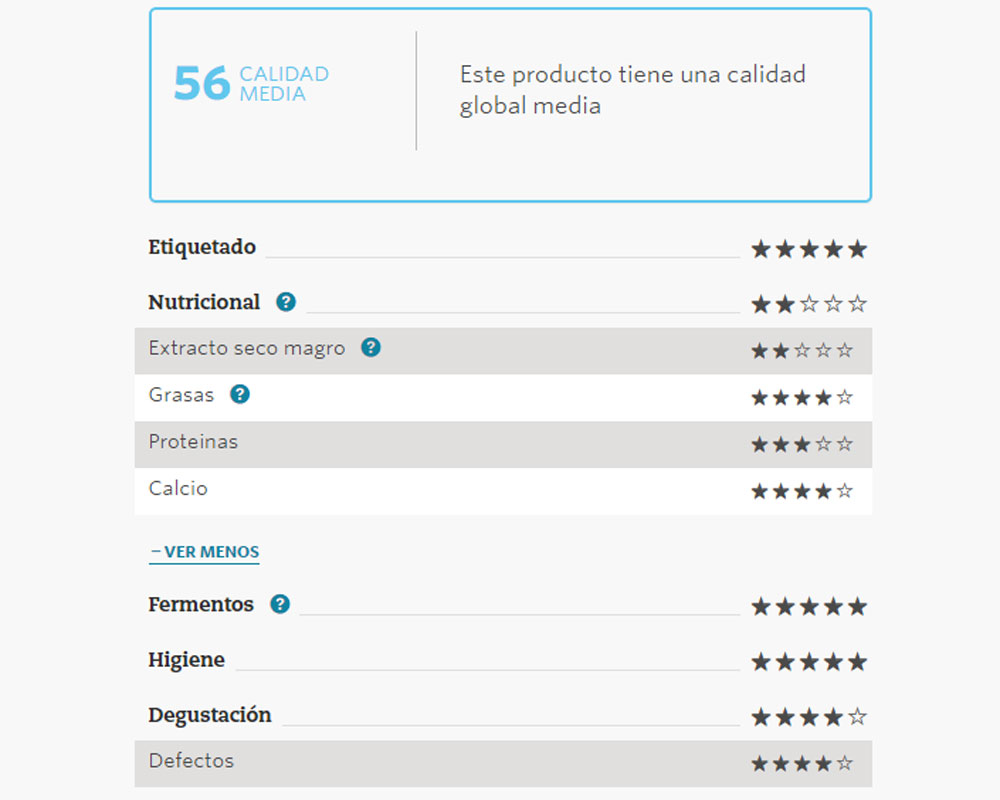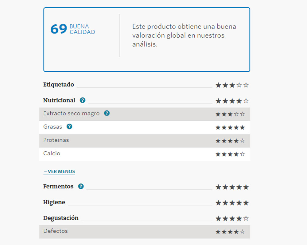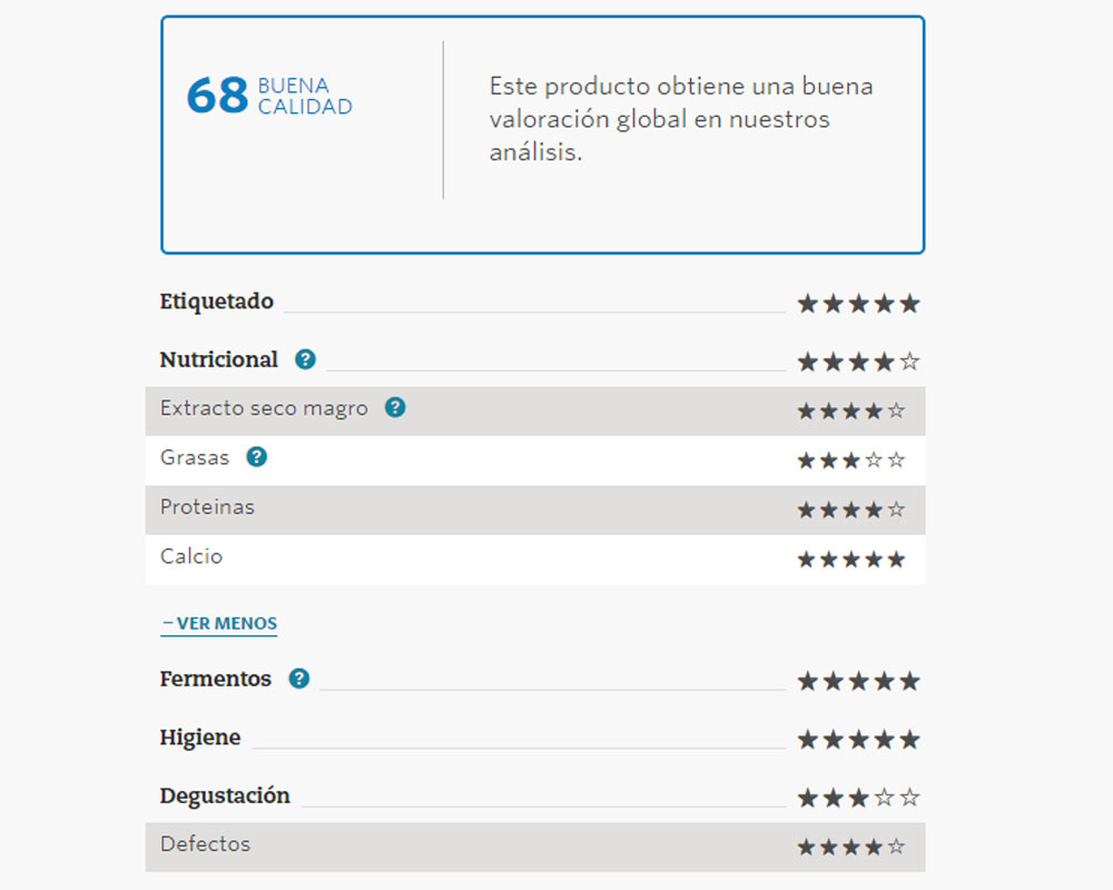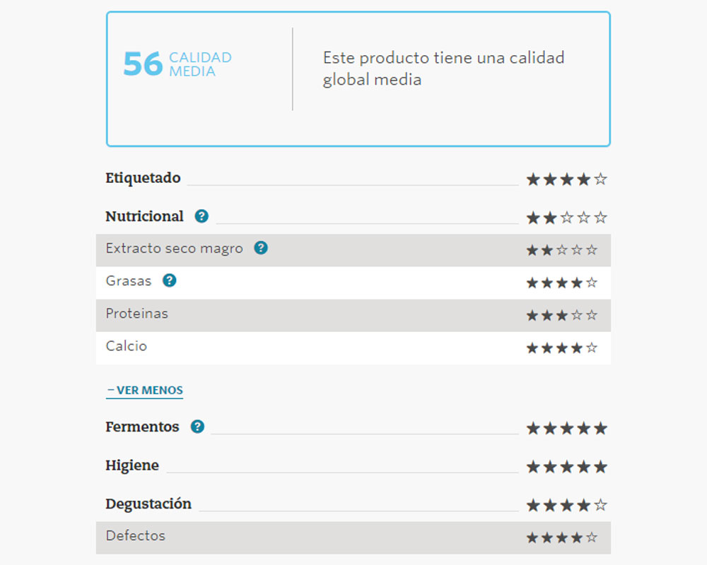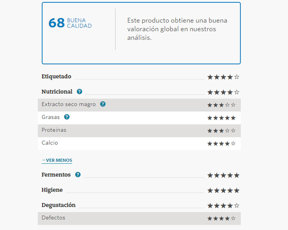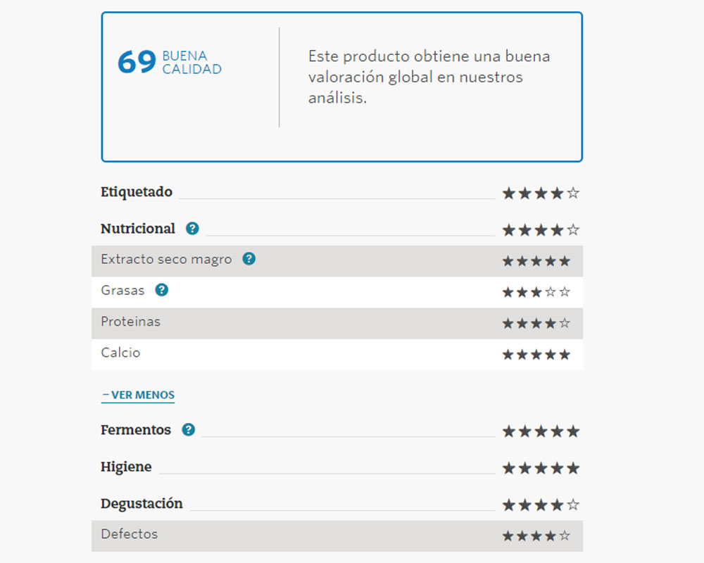 El yogur natural Danone, por cierto, uno de los más famosos, tiene una nota media, con una valoración total de 56 sobre 100. Está compuesto por leche parcialmente desnatada, leche en polvo y fermentos lácticos, y su precio es de 1,09€ por un pack de cuatro yogures.