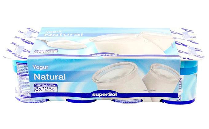 El yogur natural de Supersol tiene una valoración de 66 sobre 100. Su composición es de leche parcialmente desnatada, leche en polvo, proteínas de leche y fermentos lácticos. Para un pack de 8 envases, el precio es de 1,05€.