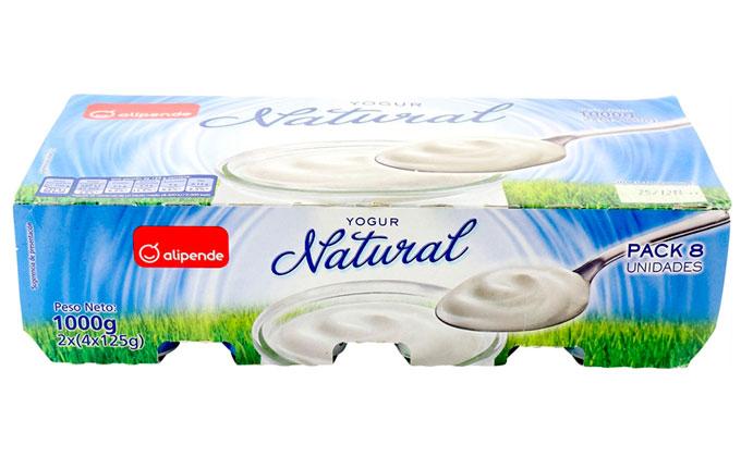 El yogur natural de Alipende, de venta solo en los supermercados Ahorra Más. Tiene una valoración global media, con un 59 sobre 100 de nota. Su lista de ingredientes es: leche parcialmente desnatada, leche en polvo y fermentos lácticos. Y su precio es de 1,05€ para un pack de ocho yogures.