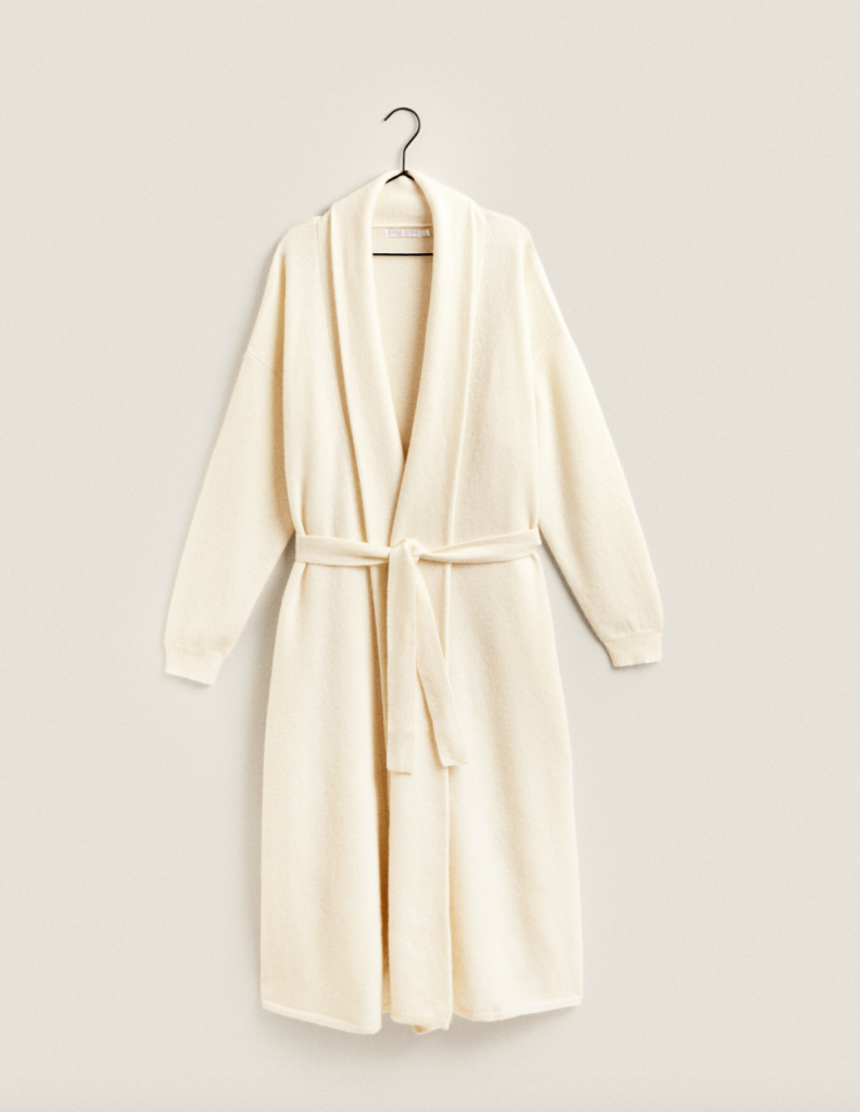 Por último, localizamos la joya del conjunto: la bata de cashmere con manga francesa y cinturón para anudar. Esta prenda de alta gama podría ser el obsequio ideal para esa mujer a la que tanto admiras. Este producto podría ser una buena opción de regalo debido a la calidad de su tejido, reconocido por su suavidad y su calidez.