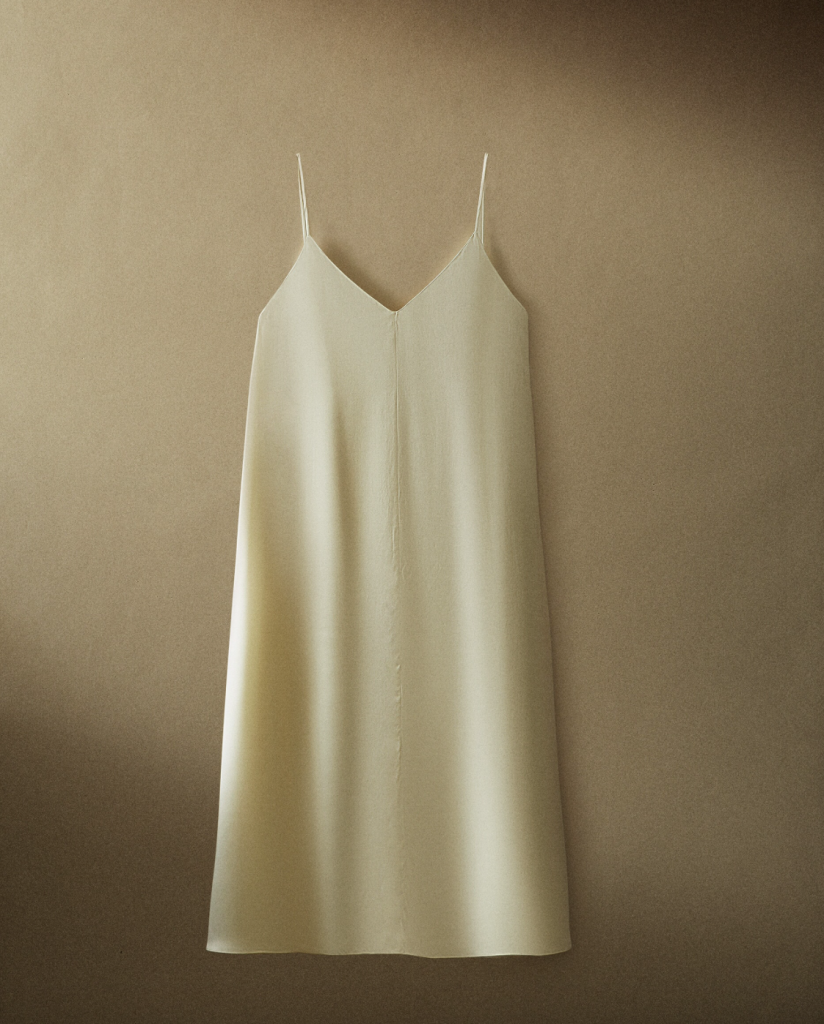 Para ir a juego, encontramos el camisón de seda midi de corte liso y tirantes finos. Esta prenda esta confeccionada con seda 100% natural, lo que la convierte en una pieza especial para disfrutar.