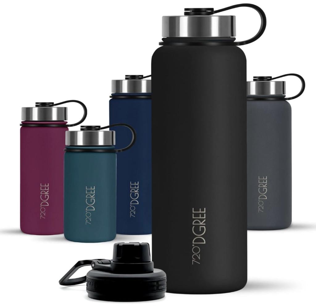 En los modelos más básicos y económicos nos podemos encontrar con diseños como el del 720º Dgree que con su tapa deportiva va a facilitar el consumo sin necesidad de desenroscarla, mientras que la tapa de acero inoxidable hermética prolonga el tiempo de retención del calor. Está fabricado con acero inoxidable 18/8 lo que le otorga robustez y resistencia a los golpes, con una capa exterior protectora disponible en varios colores y capaz de soportar arañazos.